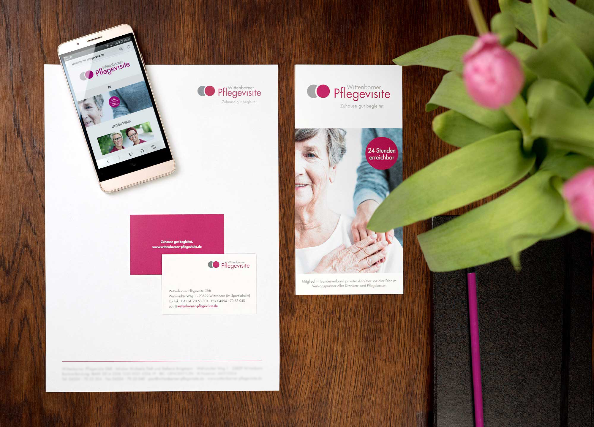 Modern wollten die Gründerinnen der Wittenborner Pflegevisite ihr Unternehmen darstellen. Das Logo und der Firmenauftritt sollten sich von den Mitbewerbern abheben, deshalb haben sie noch vor der Firmengründung Kontakt zu mir aufgenommen. Es ist ein Logo mit starkem Wiedererkennungswert und ein pfiffiger Claim entstanden. Geschäftspapiere und dazu passende Flyer wurden entworfen, Anzeigen gestaltet und die Fahrzeugbeschriftung konzipiert. Das einem im Raum Segeberg heute ständig die Minis der Wittenborner Pflegevisite begegnen, ist wohl ein Zeichen, dass sowohl die Leistungen der Pflegekräfte als auch der Firmenauftritt stimmen. Die Homepage wurde in Zusammenarbeit mit Rainer Deutschmann entwickelt.